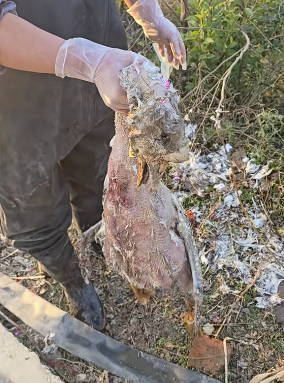 经过拔毛检查,这只大鹅全身多处有伤口,尤其是脖子处,这也成为了它死亡的直接原因之一,不过并未找到其他可疑物。